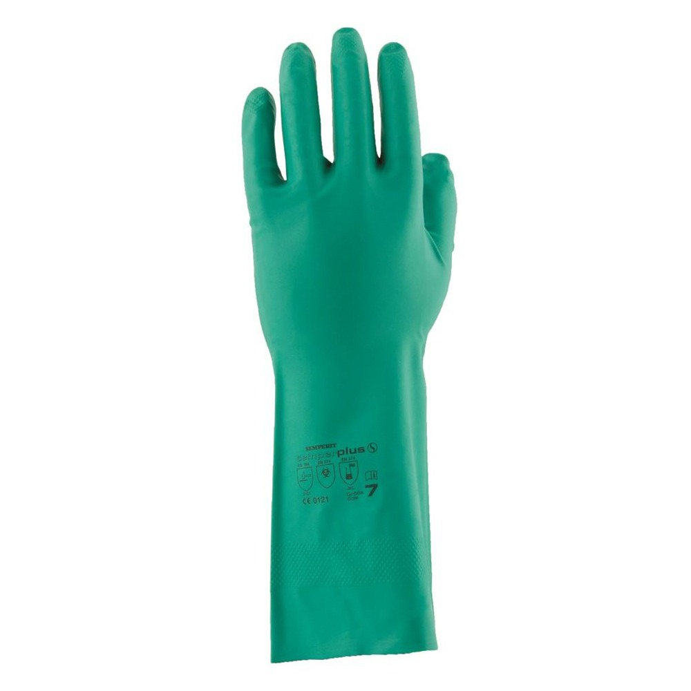 Manusi antichimice Semperplus CE CAT. III. Au rezistenta mecanica ridicata, proprietati excelente de protectie, in spacial la manipularea substantelor chimice. Au un tratament special la suprafata, pentru o prindere mai usoara si mai sigura. Grosimea palmei: 0,38 mm +/- 0,05 mm. In interior are finisaj velur. Culoare: verde. Material: nitril. Standard: EN 388 3101, EN 374-2, EN 374-3 AJK. Marimi: de la 7 la 10.